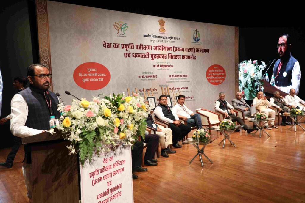 एनसीपीए येथील जमशेद भाभा थिएटर येथे आयोजित धन्वंतरी पुरस्कार वितरण सोहळा आणि ‘देश का प्रकृती परीक्षण’ मोहिमेच्या पहिल्या टप्प्याचा समारोप कार्यक्रमात श्री. जाधव बोलत होते. यावेळी सार्वजनिक आरोग्य मंत्री प्रकाश आबिटकर, आयुष मंत्रालयाचे सचिव वैद्य. राजेश कोटेचा, भारतीय चिकित्सा पद्धती राष्ट्रीय आयोगाचे सभापती वैद्य. जयंत देवपुजारी, पद्मश्री देवेंद्र त्रिगुणा, वैद्य. राकेश शर्मा, देश का प्रकृति परीक्षण अभियानाचे सचिव डॉ. आशुतोष गुप्ता, सच्चिदानंद प्रसाद यांच्यासह मान्यवर उपस्थित होते.