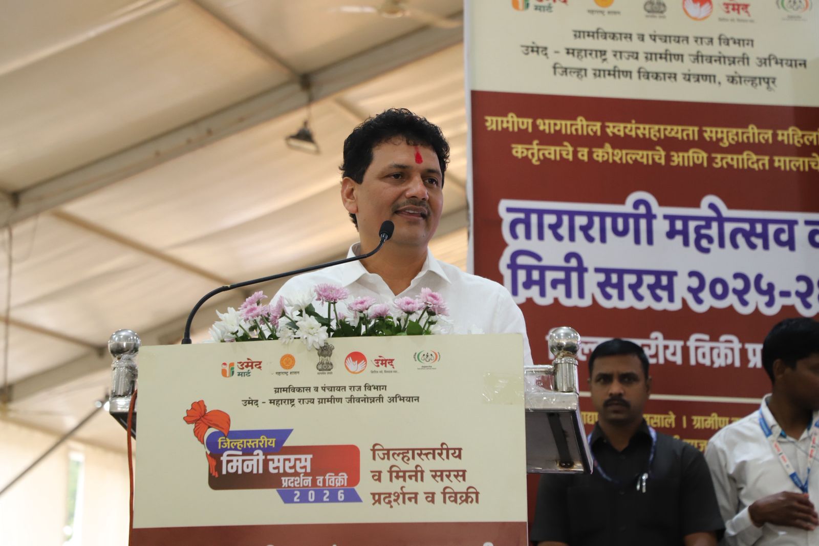 कोल्हापूर, दि. १४ (जिमाका) : उमेद महाराष्ट्र राज्य ग्रामीण जीवनोन्नती अभियानांतर्गत कोल्हापूर जिल्ह्यातील महिला स्वयंसहाय्यता बचत गटांनी उत्पादित केलेल्या वस्तूंच्या ‘ताराराणी महोत्सव’ व ‘मिनी सरस’ जिल्हास्तरीय विक्री प्रदर्शनाचे शानदार उद्घाटन सार्वजनिक आरोग्य व कुटुंब कल्याण मंत्री तथा जिल्ह्याचे पालकमंत्री प्रकाश आबिटकर यांच्या हस्ते करण्यात आले. शहरातील सासने मैदानावर आयोजित या कार्यक्रमात पालकमंत्र्यांनी प्रदर्शनाचे उद्घाटन केले आणि त्यानंतर सर्व विक्री स्टॉल्सना भेट देऊन महिलांच्या उत्पादनांची पाहणी केली.