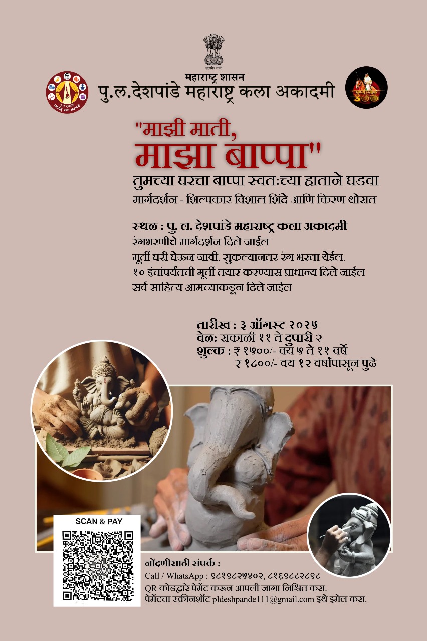 या उपक्रमामुळे सर्वांनाच पर्यावरणाविषयी जागरूकतेचा अनोखा अनुभव मिळणार आहे. घरचा गणपती स्वतःच्या हाताने घडवण्याचे समाधान आणि आनंद हाच या कार्यशाळेचा खरा गाभा आहे. मर्यादित जागा उपलब्ध. आजच नोंदणी करून आपली उपस्थिती निश्चित करावी व कलात्मक आणि पर्यावरणपूर्वक गणेशमूर्ती घडवण्यात सहभागी व्हावे, असे आवाहन पु. ल. देशपांडे महाराष्ट्र कला अकादमीकडून करण्यात येत आहे.