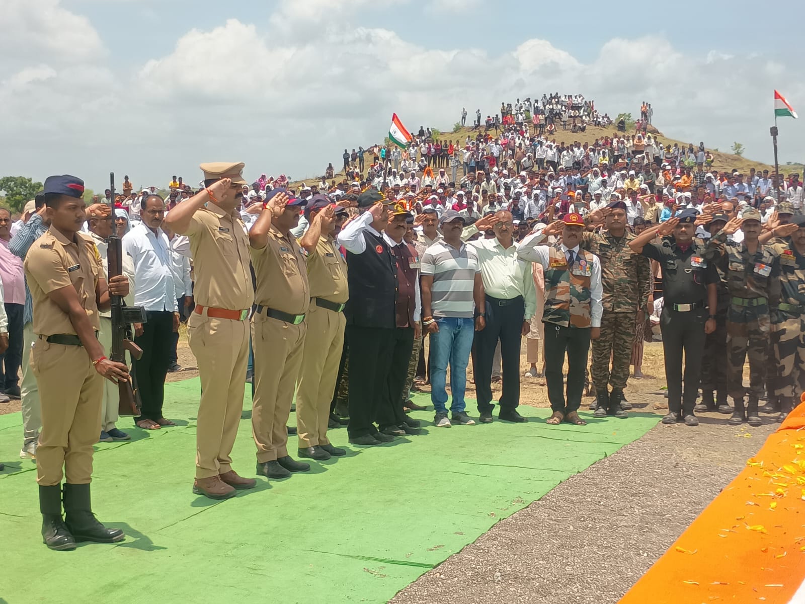 जळगाव दि. १२ (जिमाका): ५७ वाहिनी सीमा सुरक्षा दलातील कॉन्स्टेबल (जी.डी.) स्वप्नील सुभाष सोनवणे यांचा कर्तव्य बजावत असताना विजेच्या धक्क्याने झालेल्या मृत्यूनंतर आज मंगळवारी सकाळी त्यांच्या मूळ गावी गुढे (ता. भडगाव) येथे सैनिकी सन्मानाने अंत्यसंस्कार करण्यात आले. ‘वीर जवान अमर रहे’ च्या घोषणांनी संपूर्ण परिसर दुमदुमून गेला. गावातील नागरिक, नातेवाईक, मान्यवर व माजी सैनिकांनी साश्रुपूर्ण नयनांनी आपल्या वीर पुत्राला अखेरचा निरोप दिला.