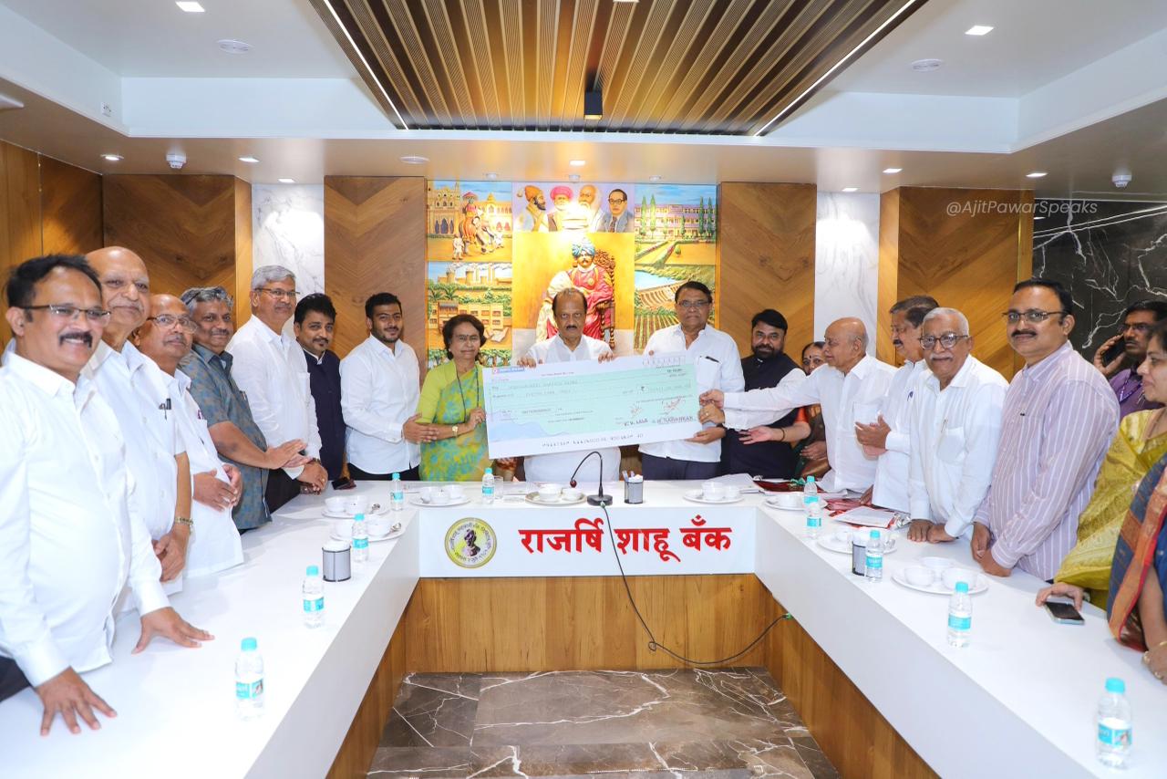 पुणे, दि.११: उपमुख्यमंत्री तथा जिल्ह्याचे पालकमंत्री अजित पवार यांच्याकडे मुख्यमंत्री सहायता निधीसाठी ११ लाख रुपयांचा धनादेश राजर्षि शाहू सहकारी बँकेच्यावतीने सुपूर्द करण्यात आला. पुरग्रस्तांना मदतीसाठी पुढाकार घेतल्याबद्दल उपमुख्यमंत्र्यांनी बँकेच्या संचालक मंडळाचे आभार मानले.