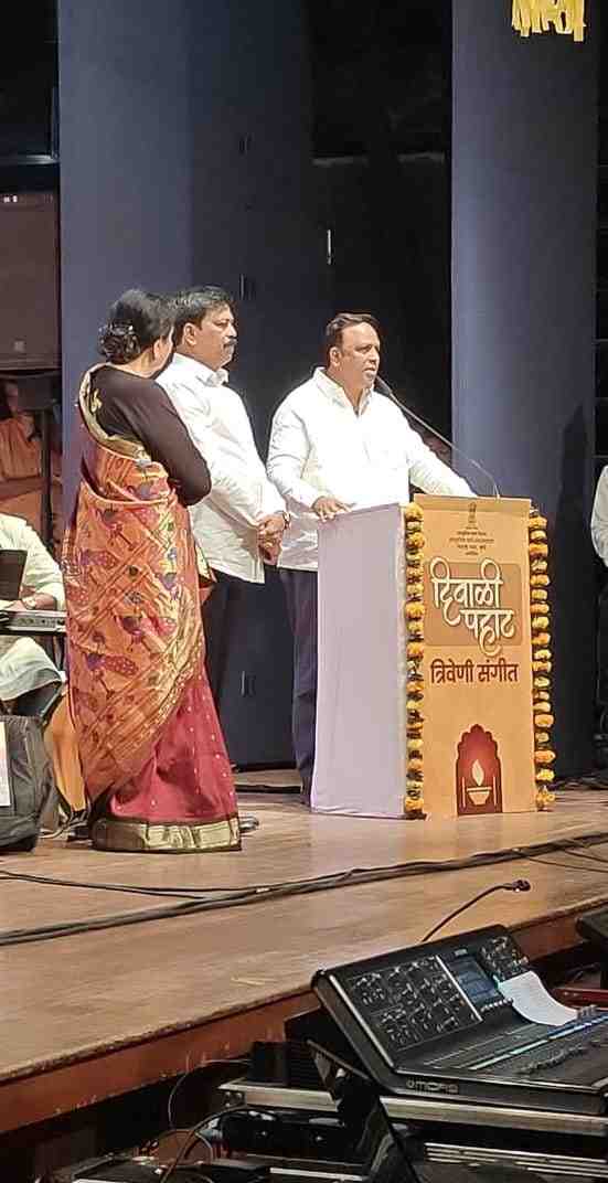 सांस्कृतिक कार्य विभागाच्या सांस्कृतिक कार्य संचालनालय, मुंबई यांच्या वतीने रसिकांची दिवाळी स्वर संगीताने उजळण्यासाठी आज स्वातंत्र्यवीर सावरकर नाट्यगृह, दादर, मुंबई येथे स्व. ग. दि. माडगूळकर, स्व. जगदिश खेबुडकर आणि स्व. मंगेश पाडगांवकर यांच्या गाजलेल्या चित्रपट गीतांचा व भावगीतांचा बहारदार कार्यक्रम दिवाळी पहाट कार्यक्रम संपन्न झाला.