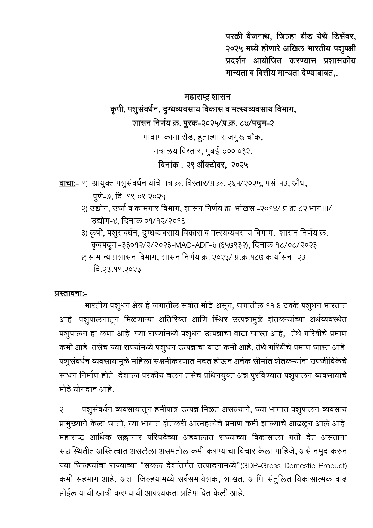 राज्यातील पशुपालकांसाठी आणि कृषी क्षेत्राशी निगडित पशुसंवर्धन उद्योगांसाठी एक मोठी उपलब्धी म्हणून परळी वैजनाथ येथे 10 ते 12 डिसेंबर 2025 दरम्यान “महापशुधन एक्स्पो 2025” हे देशपातळीवरील पशुपक्षी प्रदर्शन आयोजित करण्यात येणार आहे. मंत्री पंकजा मुंडे यांच्या पुढाकारातून होत असलेल्या या प्रदर्शनासाठी शासनाने 5 कोटी 84 लाख रूपये मंजूर केले असून याबाबतचा शासनादेश निर्गमित करण्यात आला आहे.